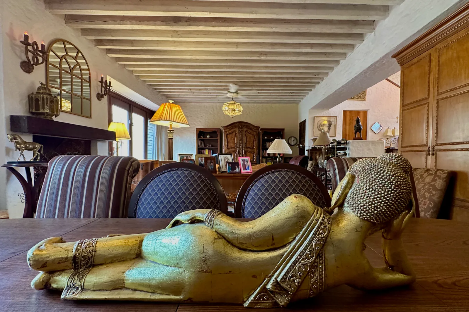 A large terrace connects one of the upstairs bedrooms, the meditation room, and the Arabic pergola, creating a seamless flow between indoor and outdoor spaces. The property also features four storage bodegas, and large garage, adding practicality to its list of exceptional features.